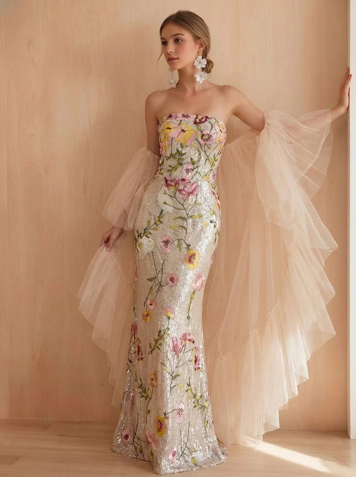Trumpet/Mermaid Strapless Sleeveless Printed Floral Evening Dresses with Embroidery