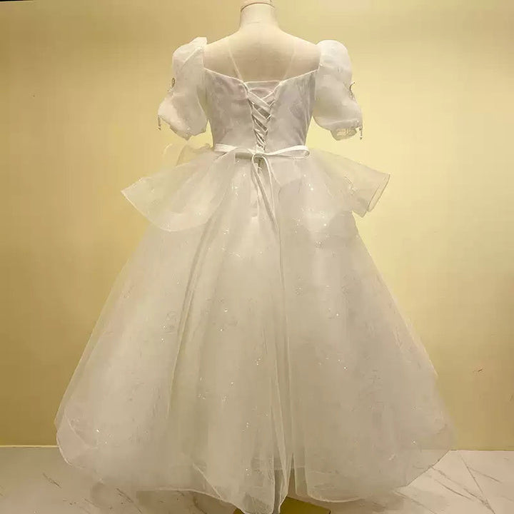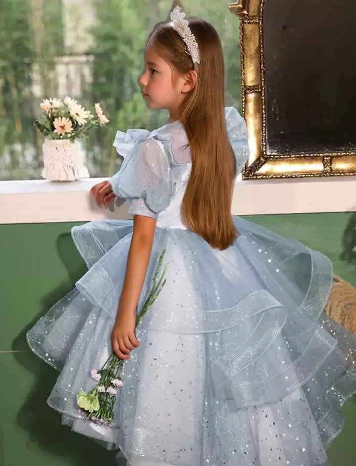 Ball Gown Short Sleeves Princess Girl Party Dresses with Rhinestone Flowers & Bow