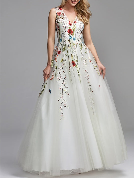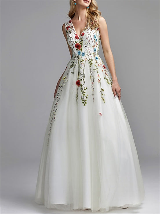 MON341637 A-Line/Princess Sleeveless V Neck Floor-Length Prom Dresses with Embroidery Appliques