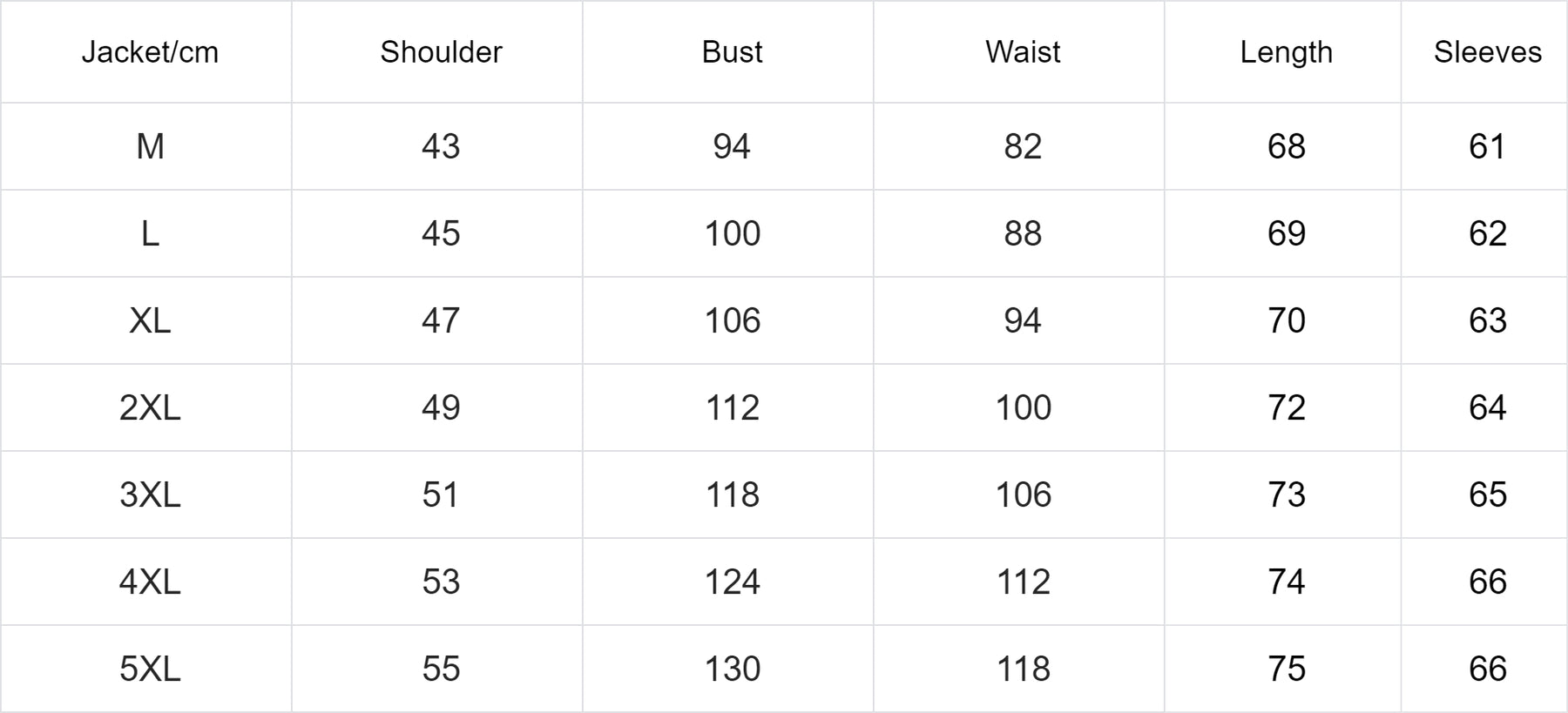 Jacket/cm | Shoulder | Bust | Waist | Length | Sleeve |