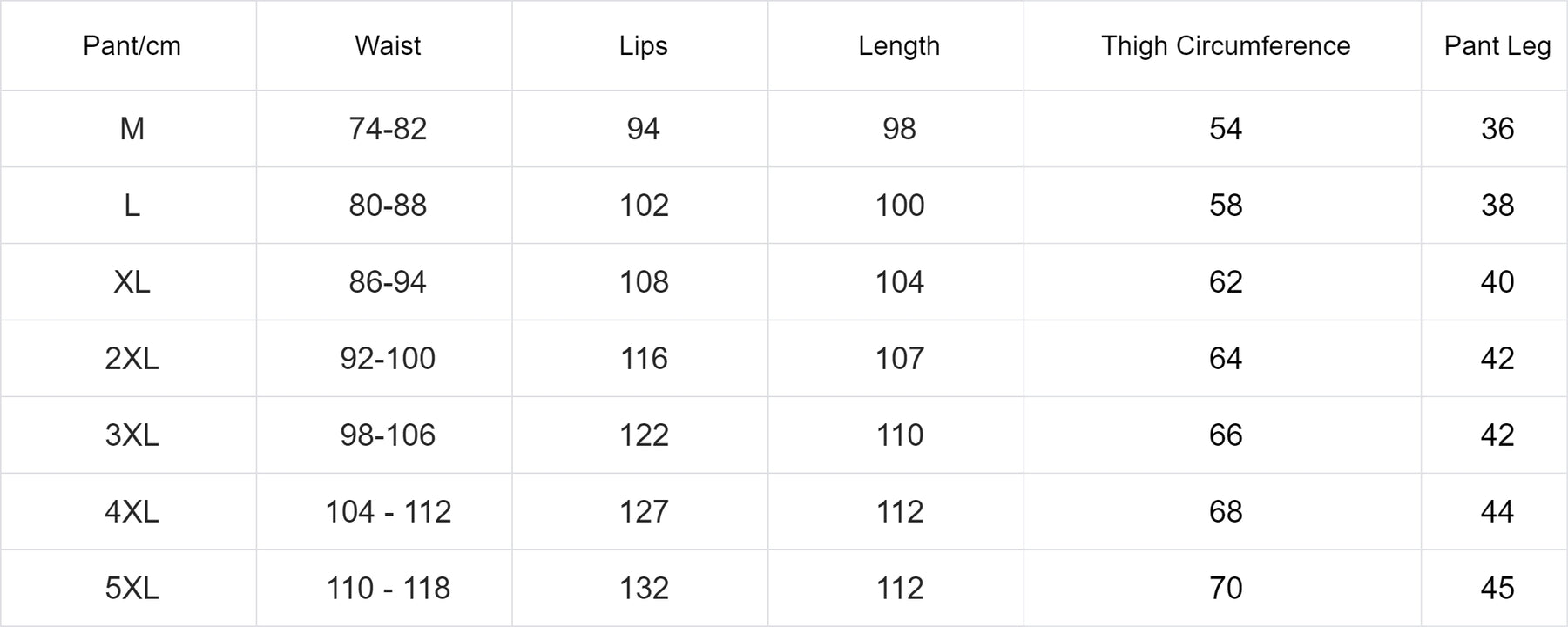 Pant/cm | Waist | Lips | Length | Thigh Circumference | Pant Leg |