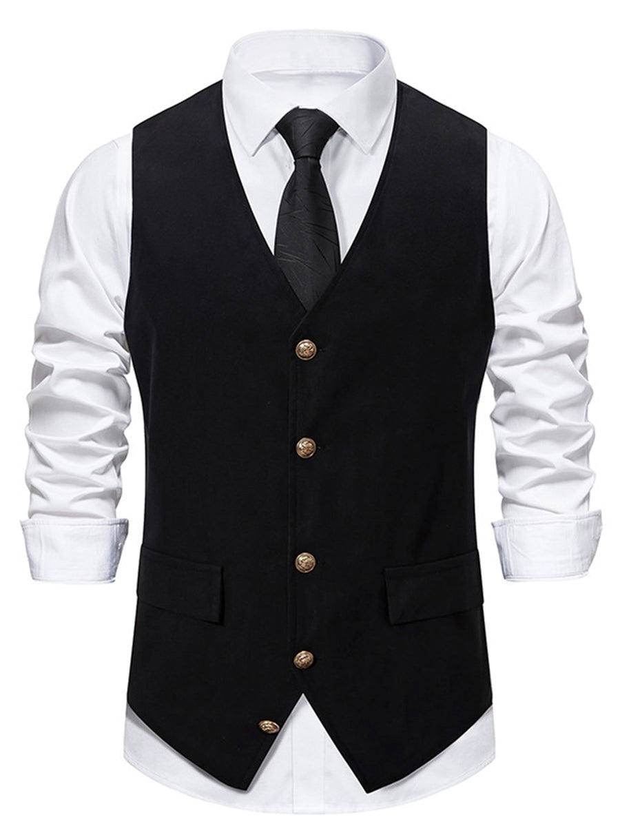 Black Men's Retro V-Neck Solid Single Breasted Buttons Casual Daily Vest with Pocket & Belt