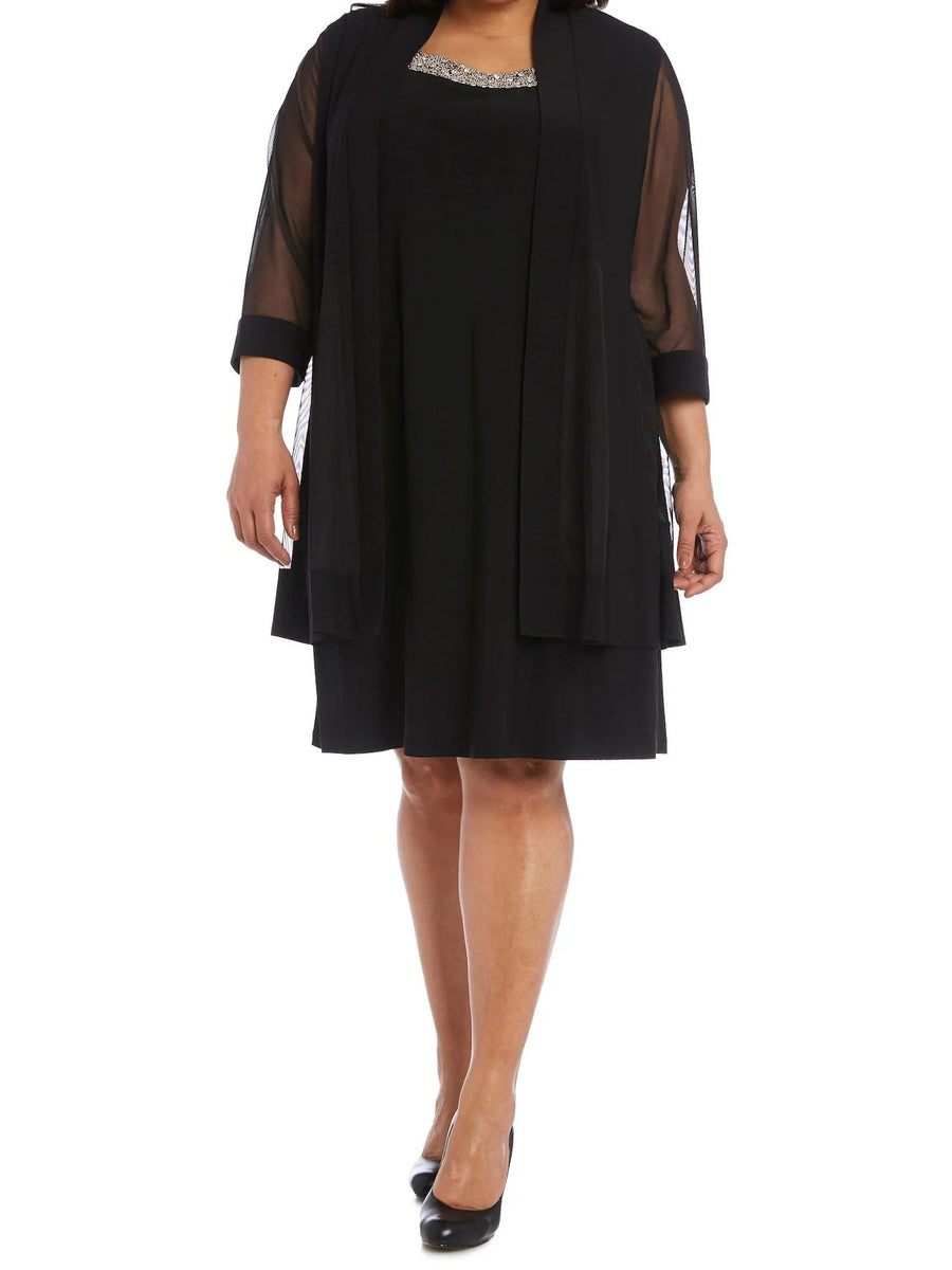 Sheath/Column 2 Pieces Round Neck 3/4 Length Sleeves Knee-Length Plus Size Mother of the Bride Dresses with Jacket & Metallic Trim