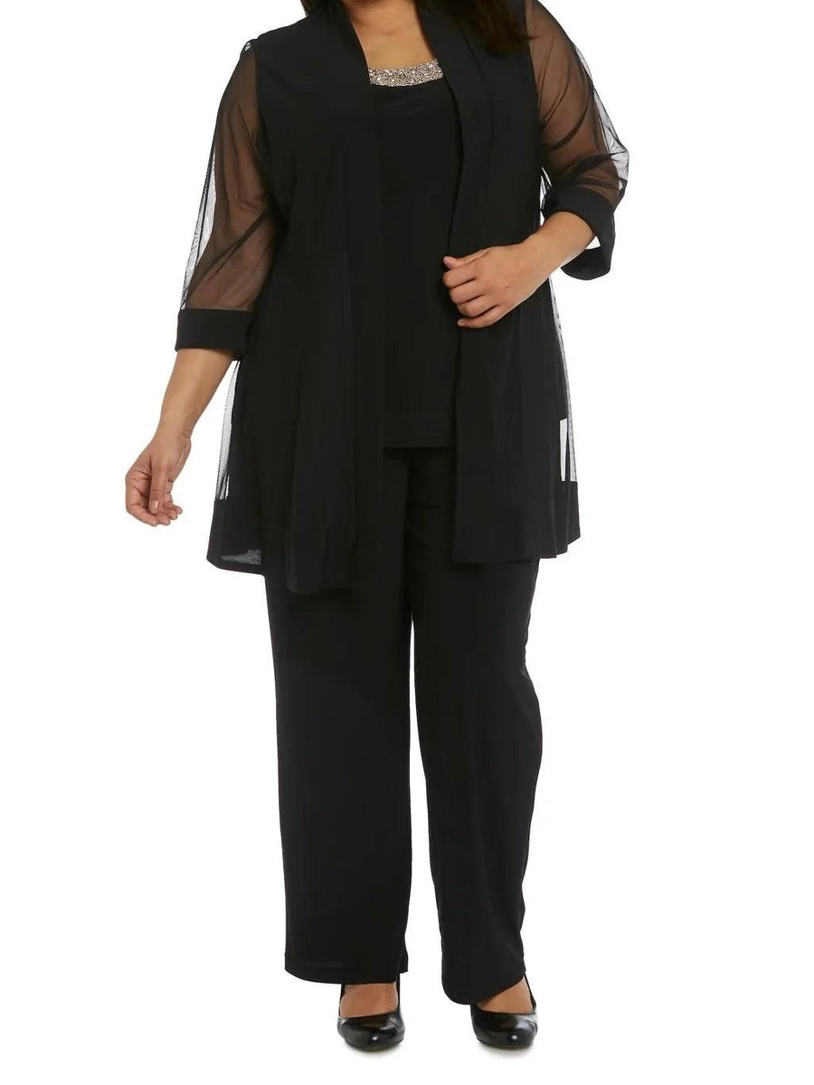 Chiffon 3 Pieces Scoop Neck 3/4 Length Sleeves Floor-Length Plus Size Mother Of The Bride Pantsuits With Jacket, Lace, Beaded & Sequins