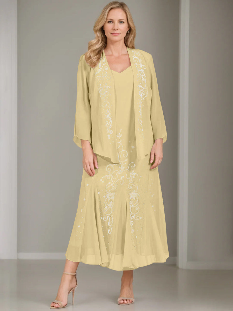 Chiffon 2 Pieces V-Neck Knee-Length Plus Size Mother of the Bride Dresses with Jacket & Sequins