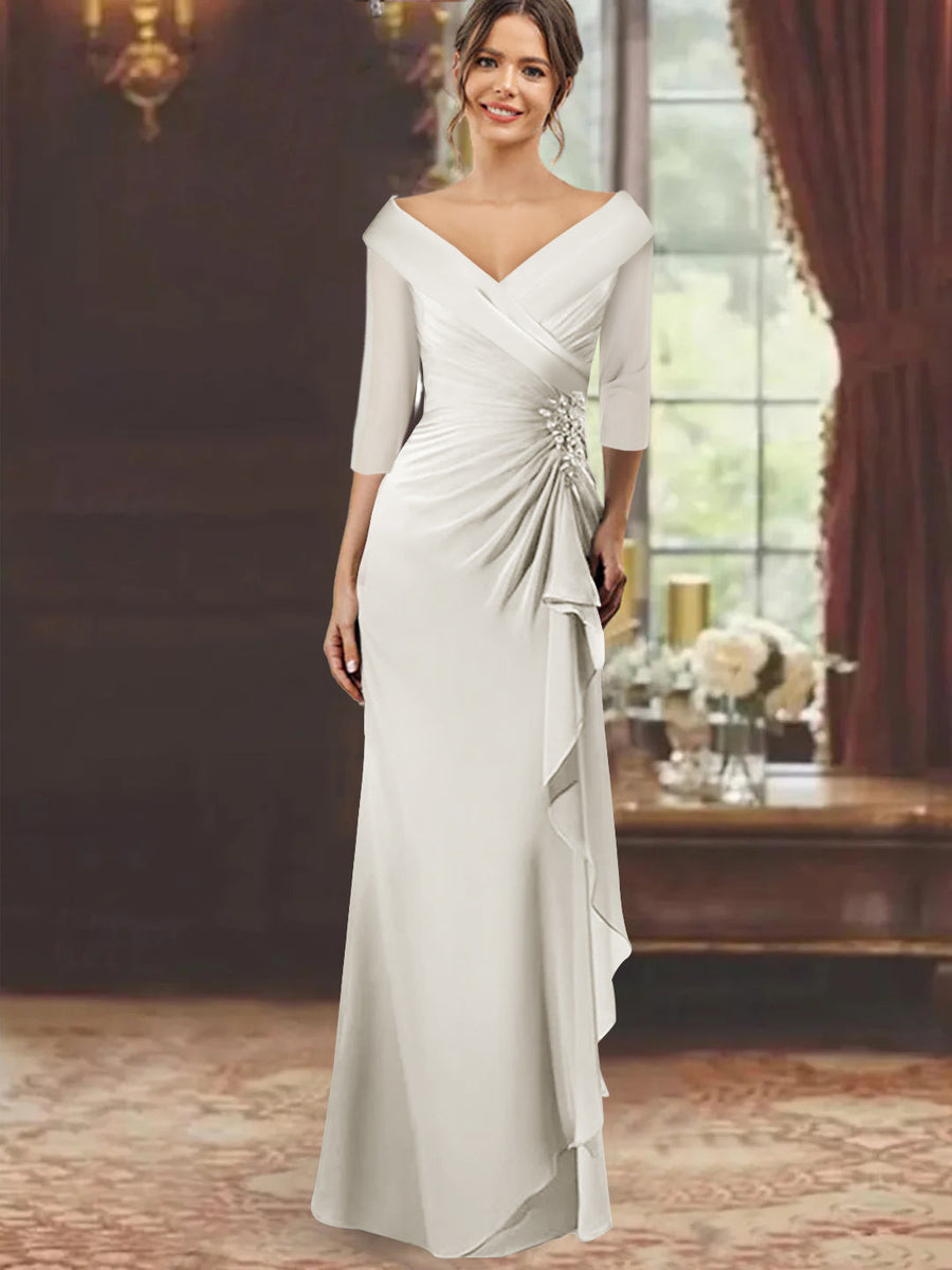 Sheath/Column V-Neck 3/4 Length Sleeves Floor-Length Unique Mother of the Bride Dresses with Ruffles & Appliques