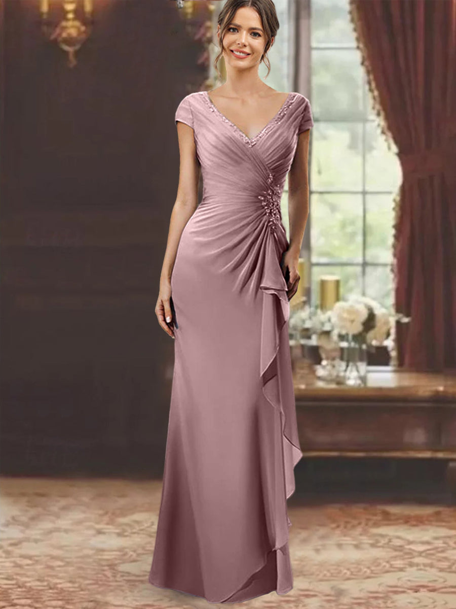 Sheath/Column V-Neck Half Sleeves Floor-Length Mother of the Bride Dresses with Ruffles & Appliques