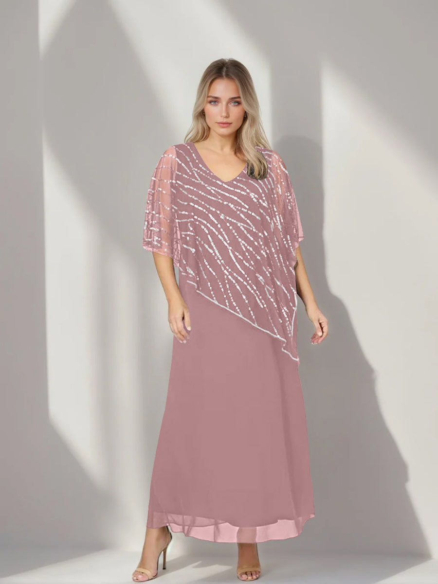 A-Line/Princess V-Neck Half Sleeves Ankle-Length Plus Size Mother of the Bride Dresses with Asymmetrical Cape Popover