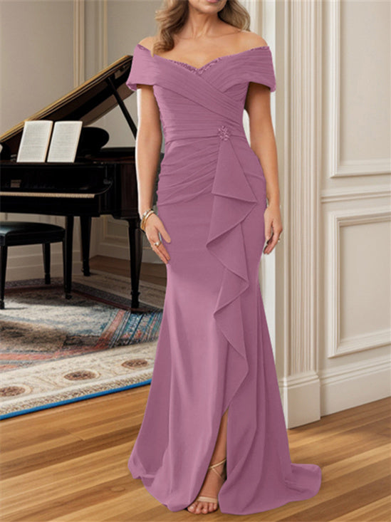 Trumpet/Mermaid One-Shoulder Short Sleeves Floor-Length Mother of the Bride Dresses with Ruffles & Split Side