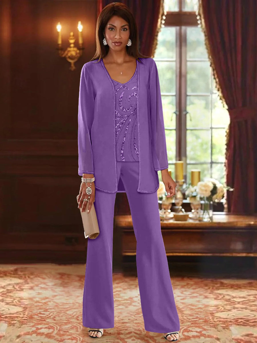 Chiffon V-Neck Floor-Length 3 Pieces Mother of the Bride Pantsuits with Jacket & Sequins