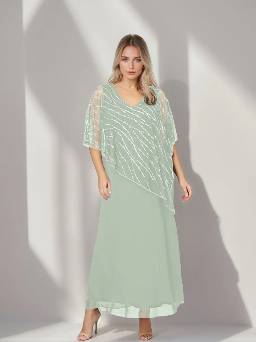 A-Line/Princess V-Neck Half Sleeves Ankle-Length Plus Size Mother of the Bride Dresses with Asymmetrical Cape Popover