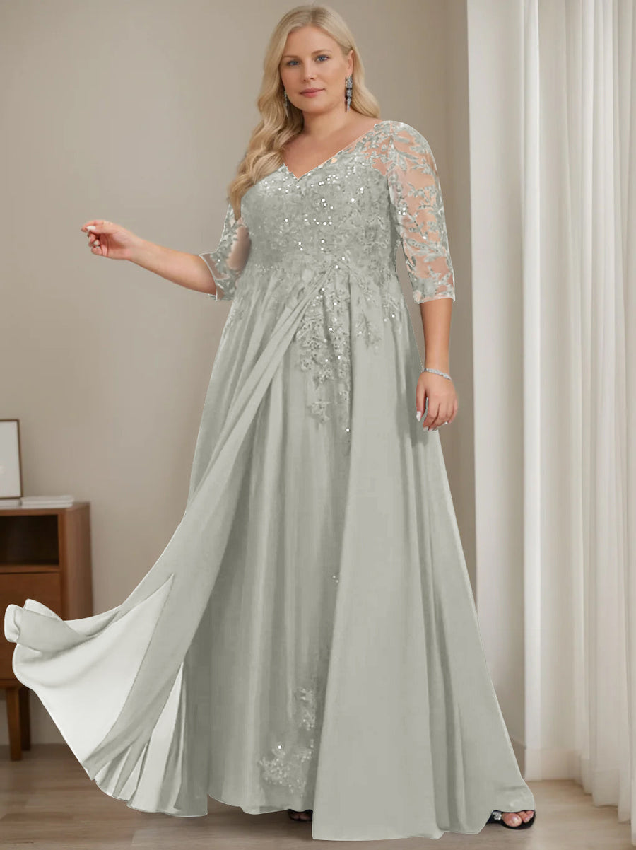 A-Line/Princess V-Neck 3/4 Length Sleeves Floor-Length Mother Of The Bride Dresses with Appliques & Sequins