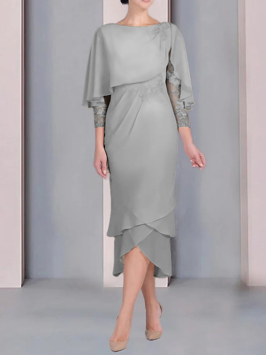 Sheath/Column Scoop Short Sleeves Tea-Length Mother of the Bride Dresses with Appliques & Lace