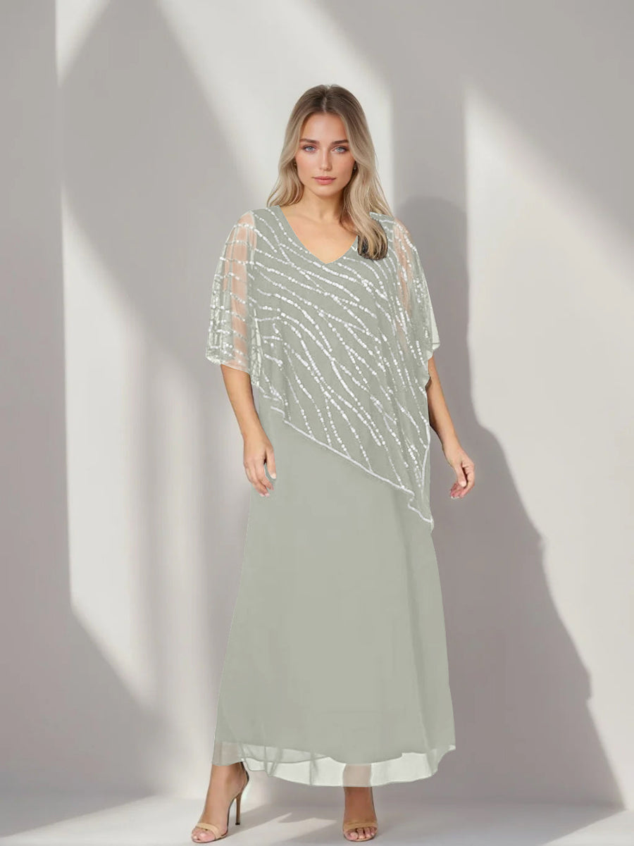 A-Line/Princess V-Neck Half Sleeves Ankle-Length Plus Size Mother of the Bride Dresses with Asymmetrical Cape Popover
