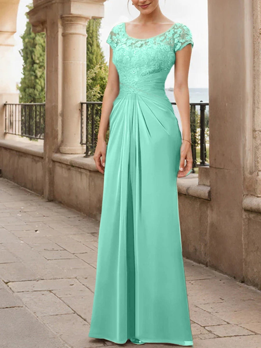 A-Line/Princess Jewel Neck Short Sleeves Floor Length Mother of the Bride Dress with Pleats & Beading