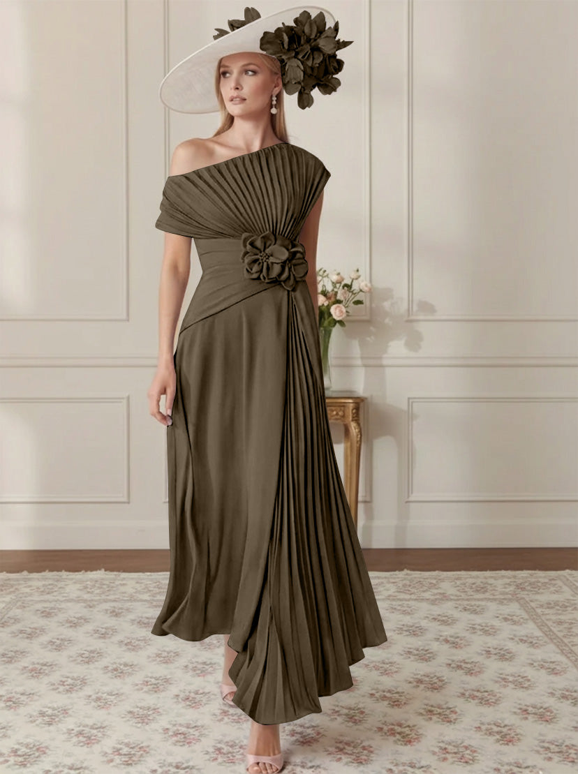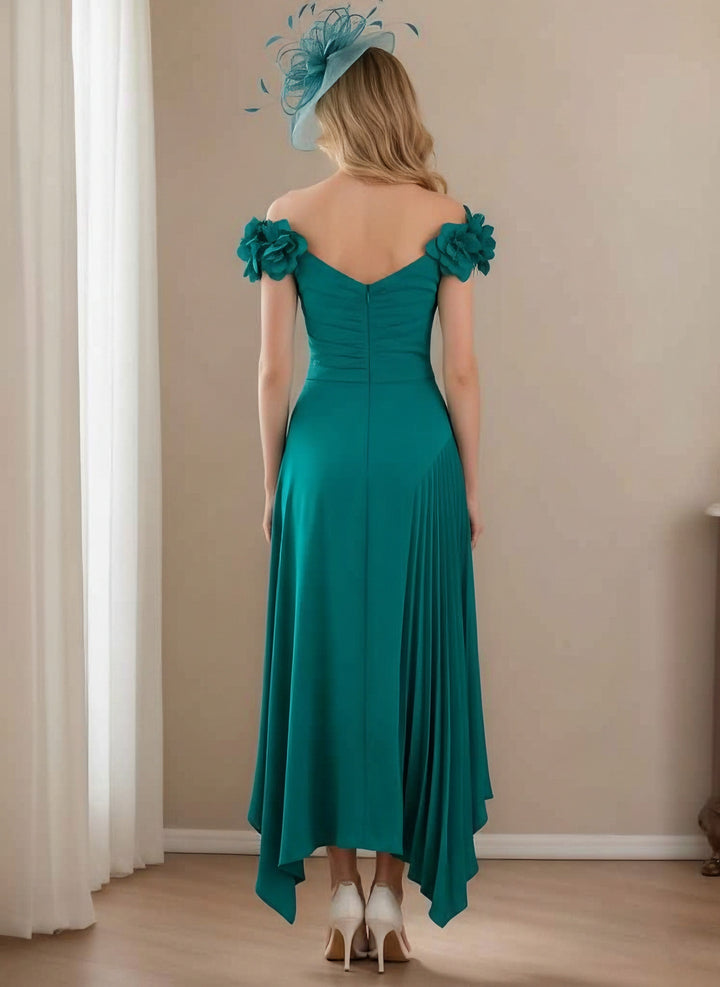 Sheath/Column Off-the-Shoulder Pleated Tea-Length Mother of the Bride Dresses with 3D Flower