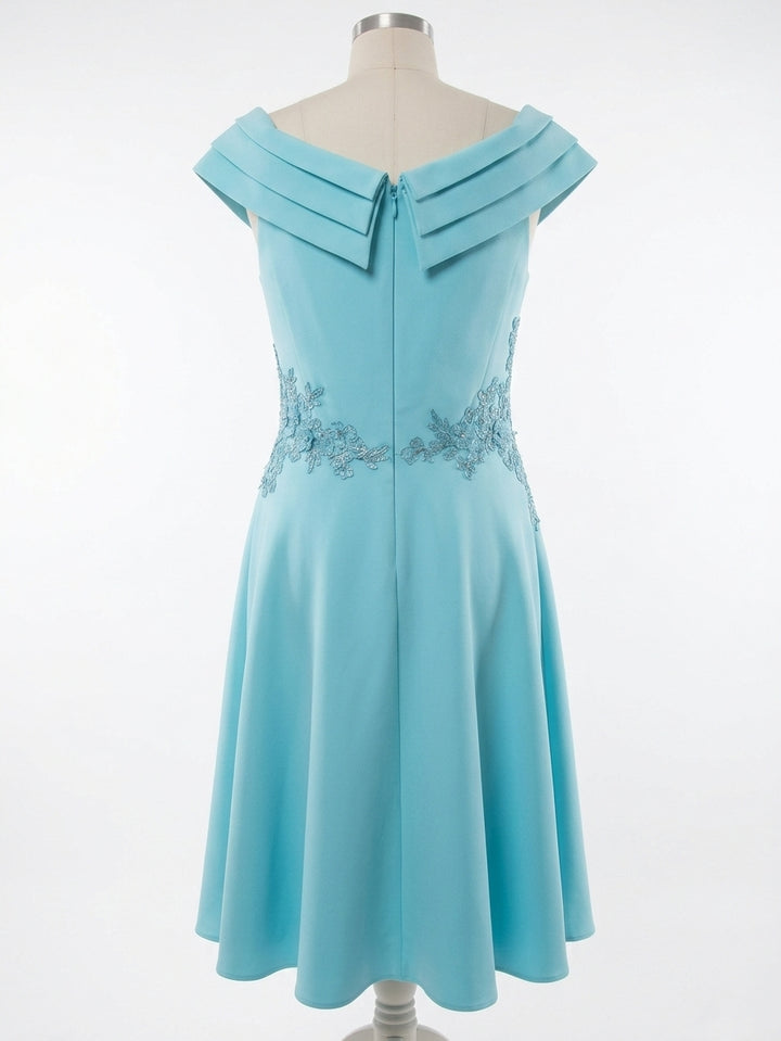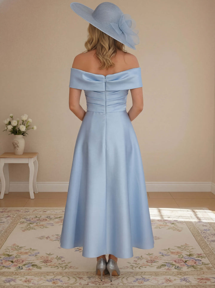 A-Line/Princess Off-the-Shoulder Mother of the Bride Dresses Stretch Satin Tea-Length Sleeveless Pleated with Pocket
