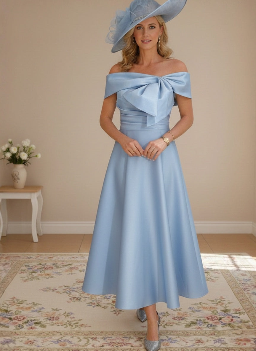 A-Line/Princess Off-the-Shoulder Tea-Length Mother of the Bride Dresses with Bowknot & Pocket