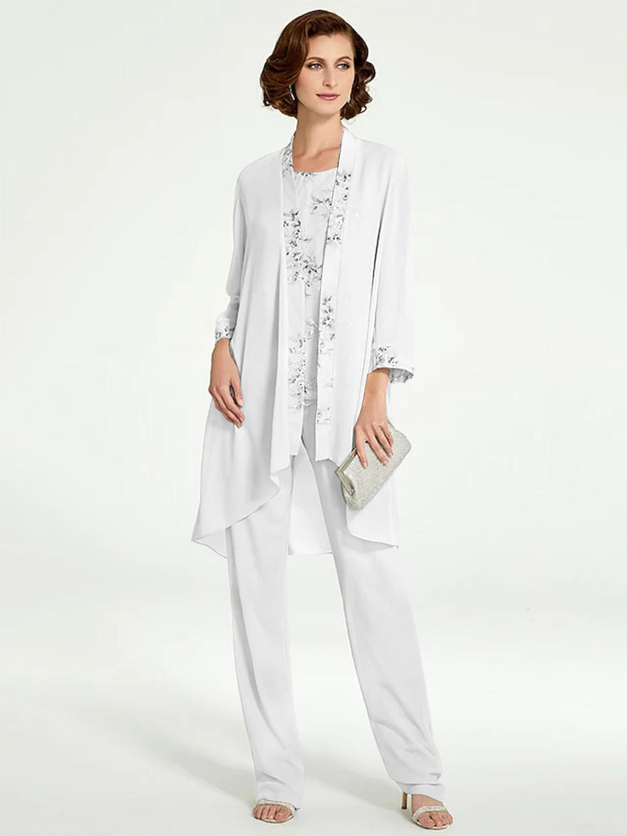 2 Pieces Chiffon Round Neck Floor-Length Mother of the Bride Pantsuits with Ruffles & Sequins & Beading