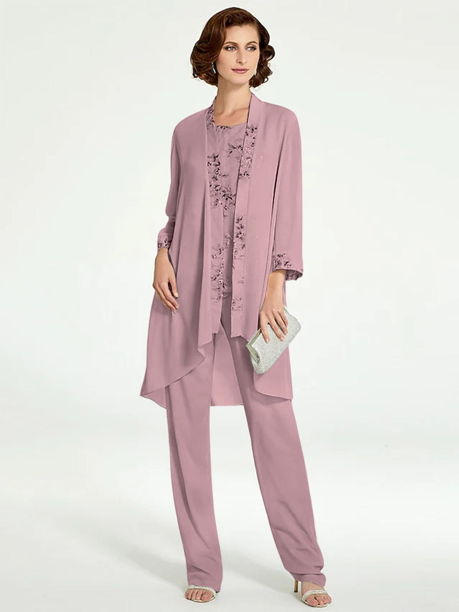 Chiffon Round Neck Floor-Length Mother Of The Bride Pantsuits With Jacket & Applique